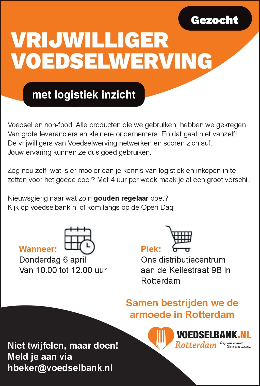 Mede daarom zoekt ons team Voedselwerving versterking. Kanjers die bereid zijn om elke week een paar uurtjes te netwerken, te regelen en te 'logistieken'. Op vrijwilligersbasis, uiteraard. Benieuwd of dat iets voor jou is? Kom dan donderdag 6 april kennismaken in ons distributiecentrum. Of reageer op de vacature.